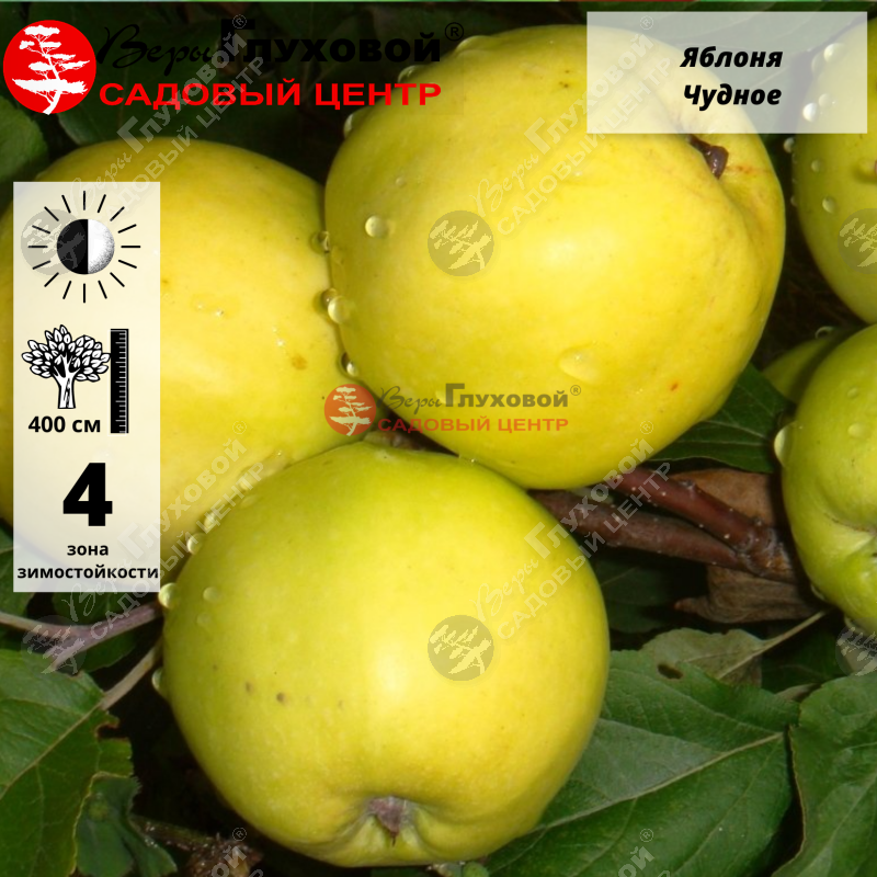 Карликовый морозостойкий сорт, обладающий множеством положительных качеств. Среди них обильное плодоношение, замечательный кисло-сладкий вкус яблок, способность переносить суровые зимы, скороплодность, устойчивость к парше. Сорт способен давать урожай без участия других опылителей. В этом случае только часть цветков опылится. Для увеличения процента оплодотворенных цветков используют другие яблони родственного вида. Для сорта яблони Чудное – это карликовые сорта уральских яблонь.