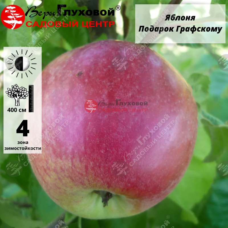 Описание Яблоня Подарок Графскому. Плоды крупные, разнокалиберные, часто более 200 граммов, иногда до 350. Форма их неровная, а кожица красивая, гладкая и очень яркая. Она покрыта интенсивным красно-фиолетовым румянцем и восковым налетом. Оржавленности на поверхности яблок нет.